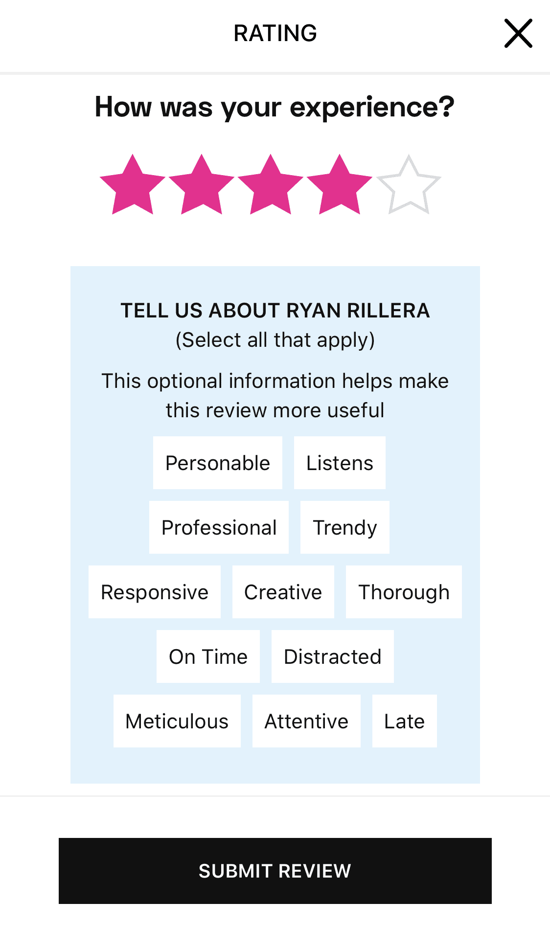 After a client wraps up their appointment, they will be prompted to leave a photo along with their written review. Here your client can rate their experience and upload photos from their library or snap them on the spot.