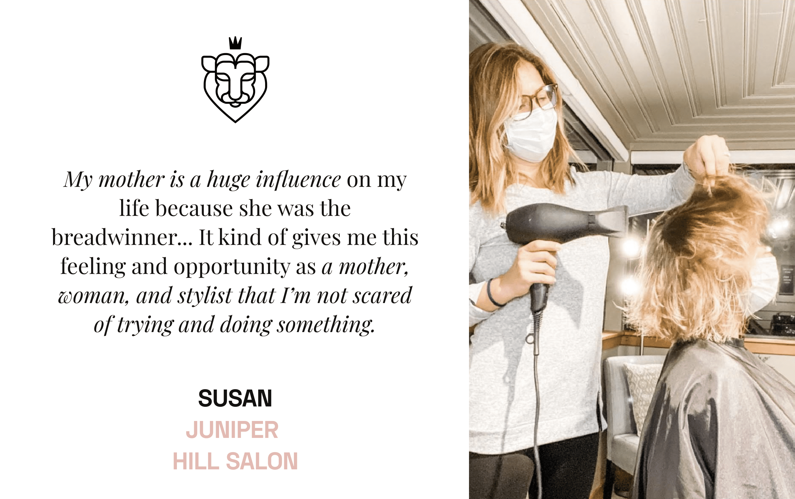 Susan Williams, hairstylist and owner of Juniper Hill Salon in Camano Island, WA, fondly remembers doing her first braid at the age of 3. But she’s been styling hair professionally since 2008. “It’s in my blood,” she says. “I just always craved this. My personality lines up to exactly living this life.”